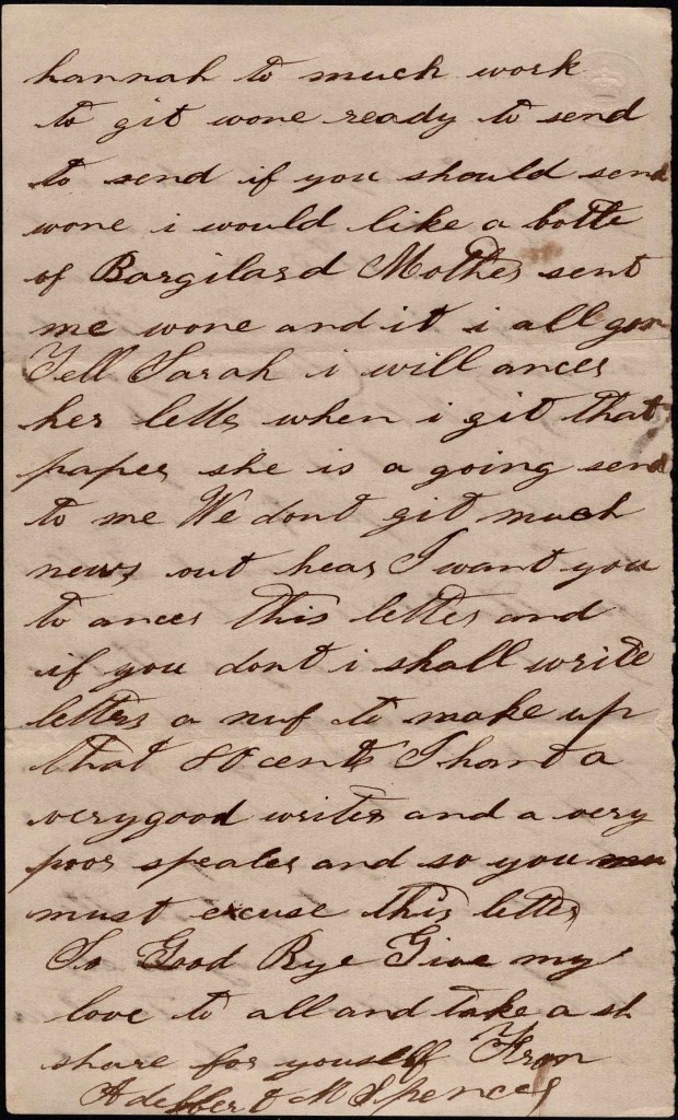 Tell Sarah I will answer her letter when I get that paper she is a going to send to me. We don’t get much news out here. I want you to answer this letter and if you don’t, I shall write letters enough to make up that 80 cents. I hain’t a very good writer and a very poor speller and so you must excuse this letter. So goodbye. Give my love to all and take a share for yourself. From Adelbert M. Spencer
