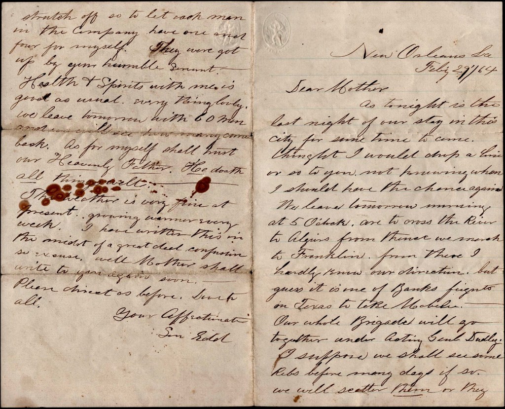 As tonight is the last night of our stay in the city for some time to come, thought I would drop a line or so to you not knowing when I should have the chance again. We leave tomorrow morning at 5 o’clock a.m. to cross the river to Algiers. From thence we march to Franklin [and] from there I hardly know our destination but guess it is one of Banks feints on Texas to take Mobile. Our whole Brigade will go together under Acting Gen. Dudley. I suppose we shall see some Rebs before many days. If so, we will scatter them or they will us. Banks is bound to do something for his country ‘ere the next three months passes.