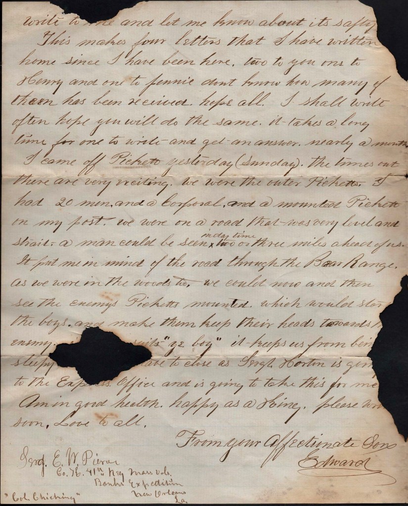 It should be noted that the first two letters were written while Edward served in Co. H, 41st Massachusetts Infantry. The last two letters were written after the regiment had been mounted and designated the 3rd Massachusetts Cavalry.