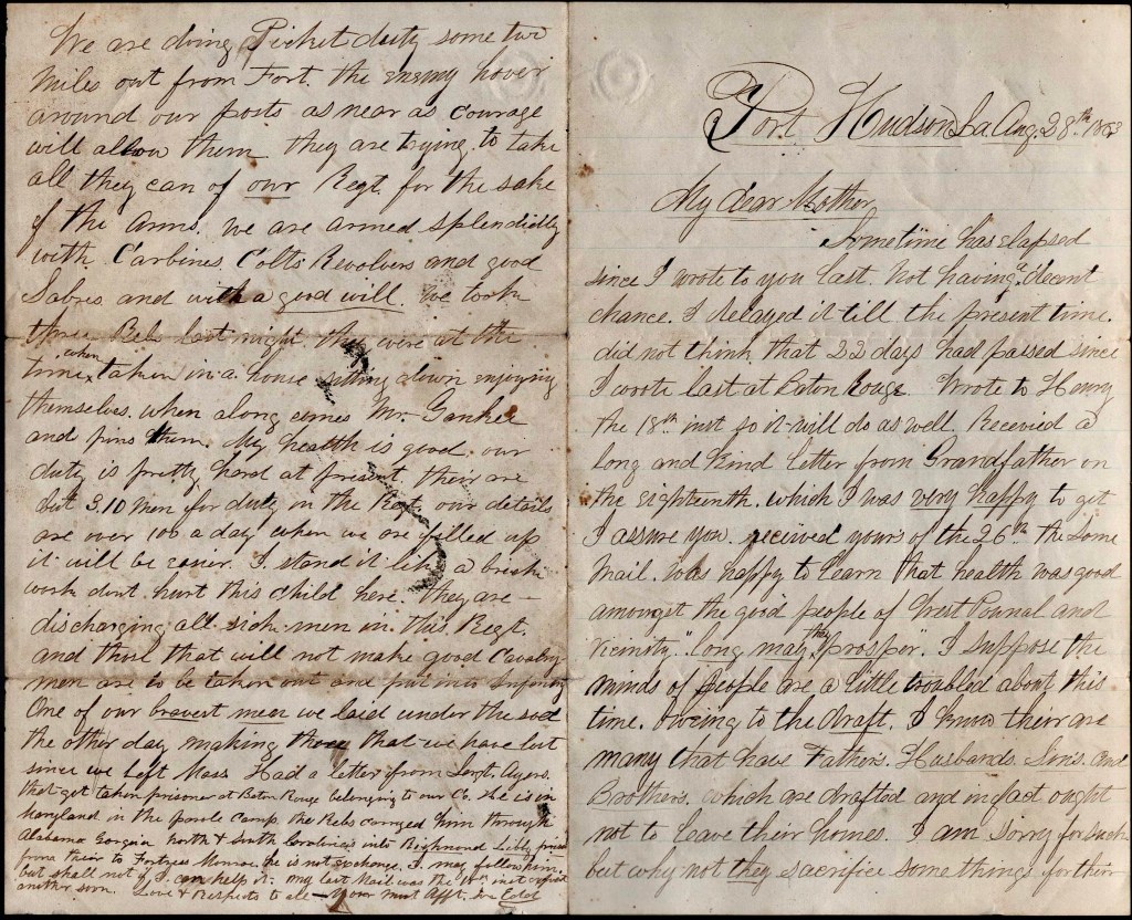 We are doing picket duty some two miles out from fort. The enemy hover around our post as near as courage will allow them. They are trying to take all they can of our regiment for the sake of the arms. We are armed splendidly with carbines, Colts revolvers, and good sabers and with a good will. We took three Rebs last night. They were at the time, when taken, in a house sitting down enjoying themselves when along came Mr. Yankee and pins them.