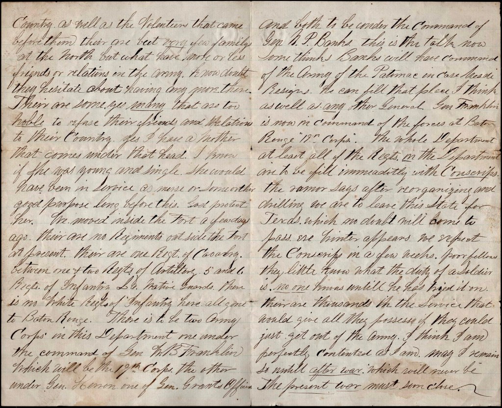 We moved inside the fort a few days ago. There are no regiments outside the fort at present. There are one regiment of cavalry, between one & two regiments of artillery, 5 and 6 regiments of infantry—[all] Louisiana Native Guards. There is no white regiments of Infantry here. [They are] all gone to Baton Rouge. There is to be two Army Corps in this department—one under the command of Gen. W. B. Franklin which will be the 19th Corp., and the other under Gen. Herron, one of Gen. Grant’s officers, and both to be under the command of Gen. N. P. Banks. This is the talk now. Some thinks Banks will have command of the Army of the Potomac in case Meade resigns. He can fill that place as well as any other general. Gen. Franklin is now in command of the forces at Baton Rouge—“19th” Corps.