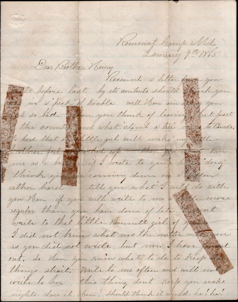 Received a letter from you night before last. By its contents, should think you was in a “peck’ of trouble. Well Hen, am sorry you feel so bad. Then you think of leaving that part of the country and what? climb a tree? or go to Canada? Too bad that one little girl will make my little brother feel so worked up. Then you won’t own me as a brother if I write to your “doxy”? Think you are coming down on a fellow rather hard. Tell you what I will do with you, Hen. If you will write to me a little more regular than you have done of late, I won’t write to that little brunette girl of yours. I did not know what was the matter with you as you did not write, but now I have found out. So Hen, you know what to do to keep old things straight. Write to me often and I will not write to her. This thing don’t keep you awake nights, does it Hen? I should think it would. ha! ha!