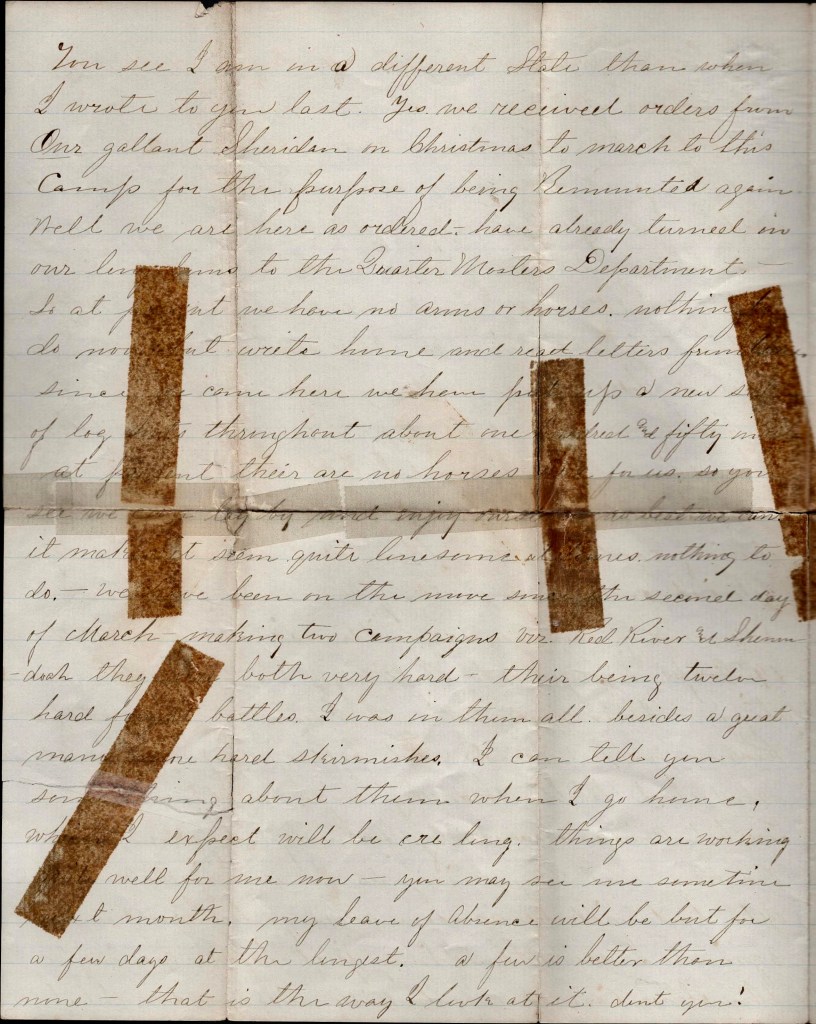 We have been on the move since the second day of March, making two campaigns via Red River and Shenandoah. They were both very hard fought battles. I was in them all, besides a great many more hard skirmishes. I can tell you something about them when I go home which I expect will be ‘ere long. Things are working quite well for me now. You may see me sometime next month. My leave of absence will be but for a few days at the longest [but] a few is better than none. That is the way I look at it, don’t you?