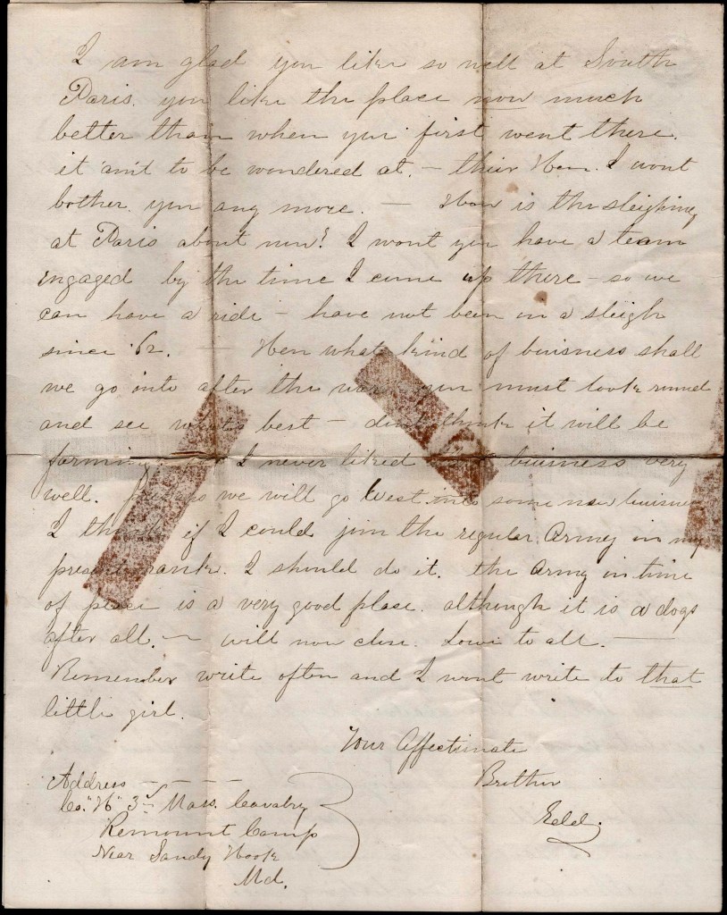 I want you to have a team engaged by the time I come up there so we can have a ride. Have not been in a sleigh since ’62. Hen, what kind of business shall we go into after the war? You must look around and see what’s best. Don’t think it will be farming. I never liked that business very well. Perhaps we will go West into some new business. I think if I could join the Regular Army in my present rank, I should do it. The Army in time of peace is a dogs [life], after all. Will now close. Love to all. Remember, write often and I won’t write to that little girl. Your affectionate brother, — Eddy