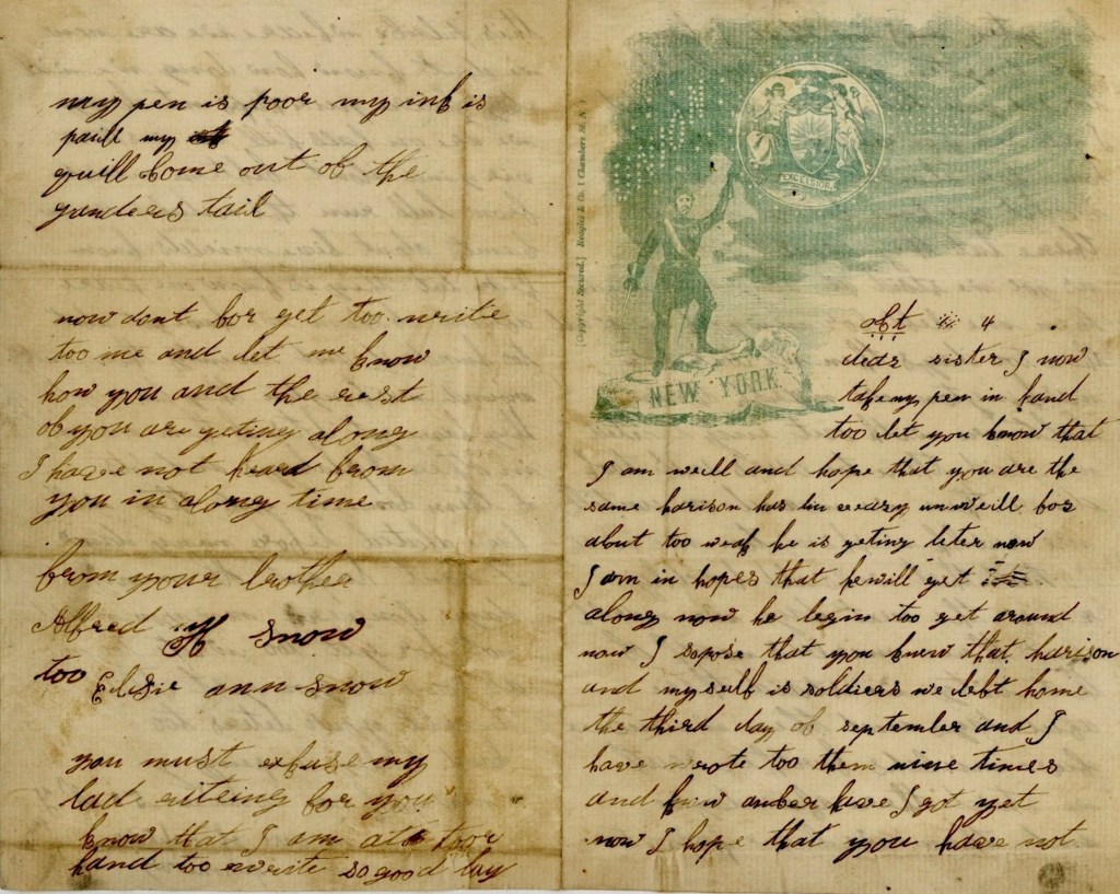 Alfred was the son of Asa Stearns Snow (1805-1882) and Mary C. Eighmey (1803-1900) of Caroline, Tompkins county, New York. He wrote the letter to his younger sister, Elsie Ann Snow (1844-1939).
