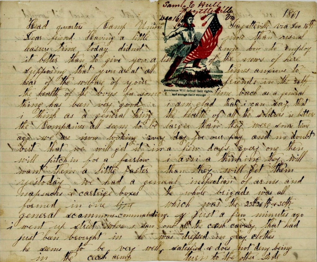 December 17th. Yesterday I undertook to write you a few lines but was called out on battalion drill so I will write a few lines more and then close. I received a letter from you while we were up at Camp Sewell and put off answering it until I got to teaming. Then I had no chance to write. I expect the paymaster will commence paying off this afternoon. One thing certain, he is here and last night his wagon came up that had the truck in to do it with. Some of the boys will not have more than enough to take them home and back again after paying the sutler. If nothing turns up more than I know of now, I intend to go home this winter on a furlough.