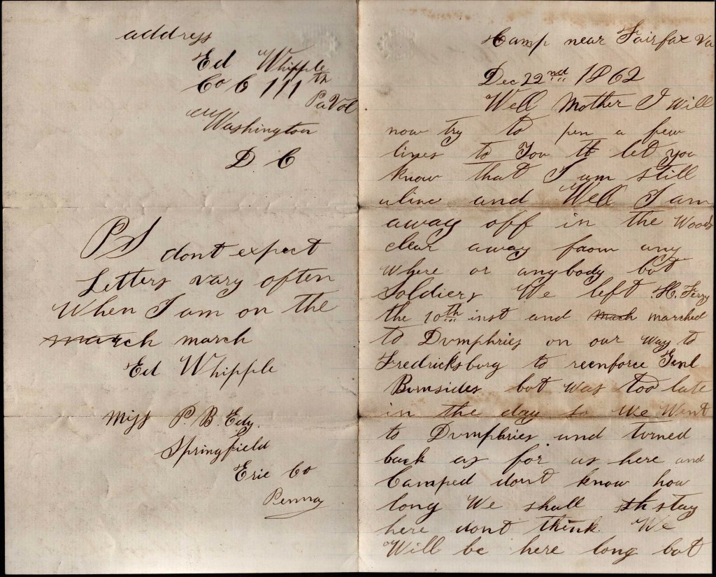 Well, Mother, I will now try to pen a few lines to you to let you know that i am still alive and well. I am away off in the woods—clear away from anywhere or anybody but soldiers. We left Harpers Ferry the 10th instant and marches to Dumfries on our way to Fredericksburg to reinforce General Burnside but was too late in the day so we went to Dumfries and turned back as far as here and camped. Don’t know how long we shall stay here. Don’t think we will be here long but can’t tell for certain.