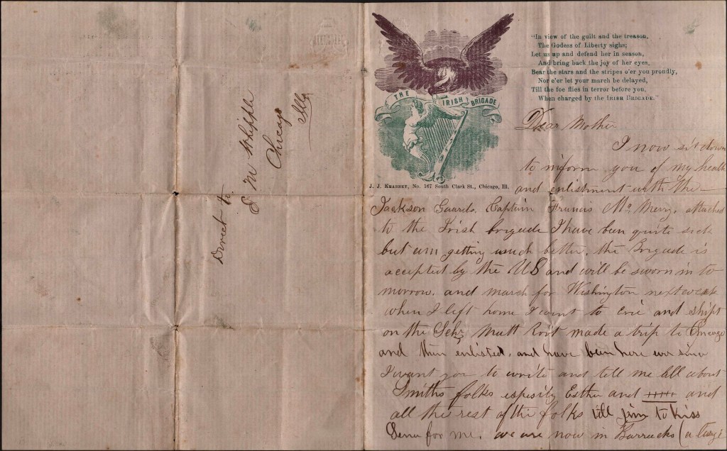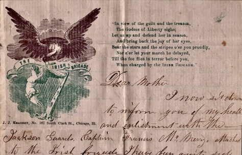 I now sit down to inform you of my health and enlistment with the Jackson Guards, Captain Francis McMurray, attached to the Irish Brigade. I have been quite sick but am getting much better. The Brigade is accepted by the U. S. and will be sworn in tomorrow and march for Washington next week.