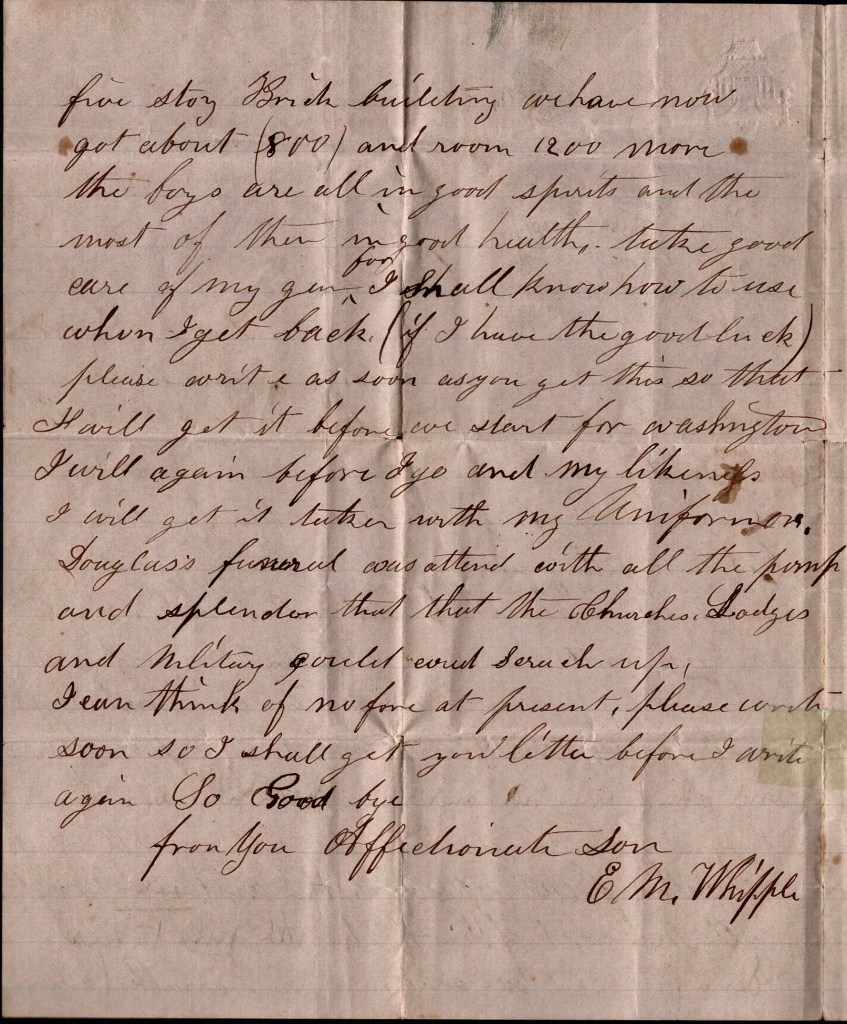 I can think of no more at present. Please write soon so I shall get your letter before I write again. So goodbye. From your affectionate son, — E. M. Whipple