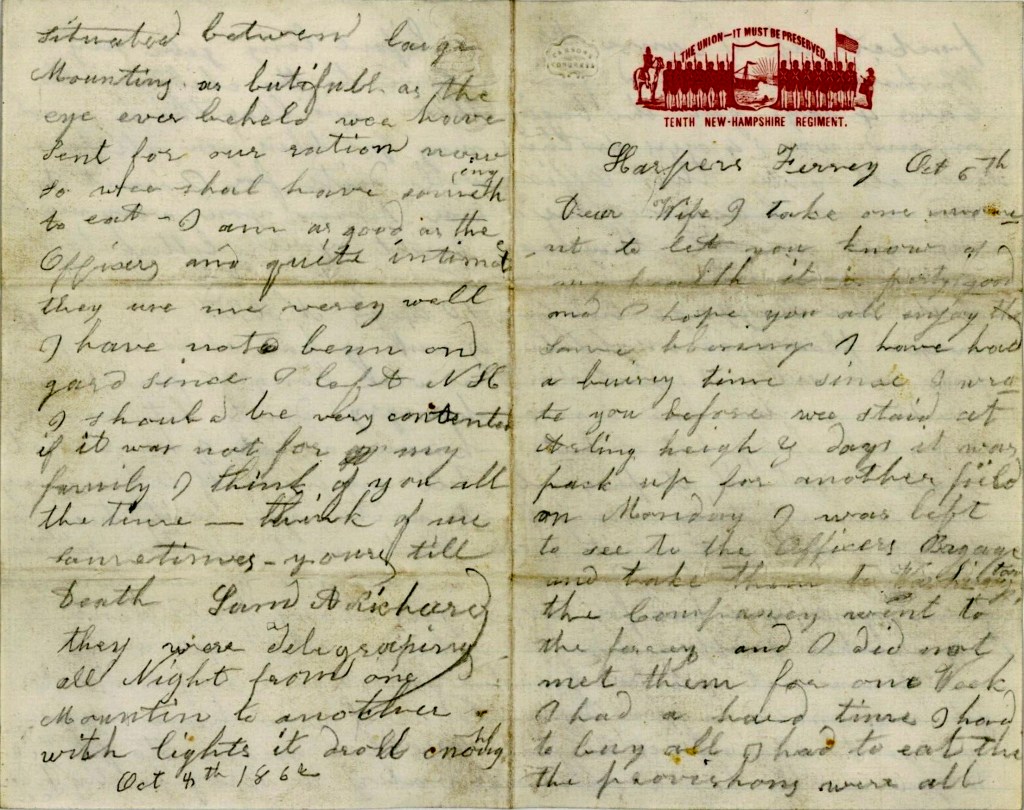 The 10th New Hampshire Infantry left New Hampshire and moved to Washington, D. C., in late September 1862. They then moved to Frederick, Maryland. and about the 1st of October to Sandy Hook, Maryland, and on October 4th to Pleasant Valley October 6 where this letter was finished. They had duty at Pleasant Valley until October 27, 1862 when they made the march to Falmouth, Va., October 27-November 19 and where they fought their first battle at Fredericksburg, December 12-15.