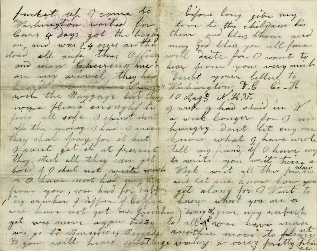Give my love to the children. Kiss them and bless them and may God bless you all. Farewell. Write for I want to hear from you very much. Direct your letters to Washington D. C., Co. H, 10th Regt. New Hampshire Volunteers.