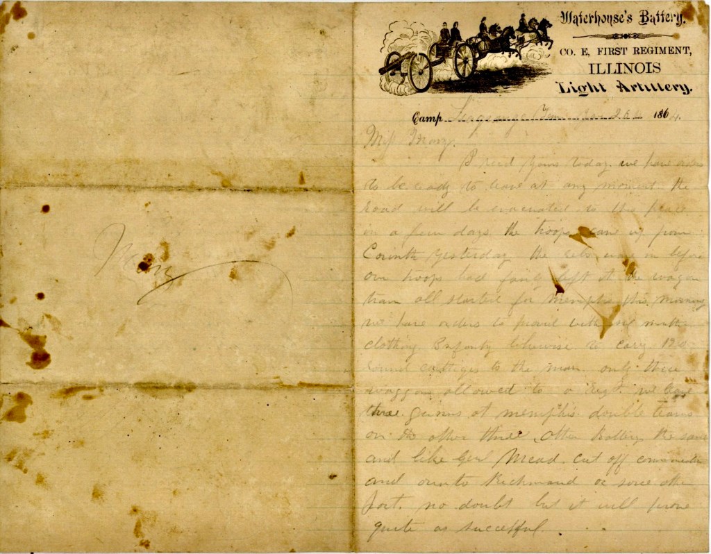 This letter is only signed “George” but it was most definitely written by a member of Waterhouse’s Battery—Co. E, 1st Illinois Light Artillery. Not only was it written on stationery branded with the unit’s name on the letterhead, but the content of the letter is consistent with the Battery’s movements as well. Regrettably there are too many George’s in the unit who were unmarried to narrow it down to less than a handful of possible soldiers.
