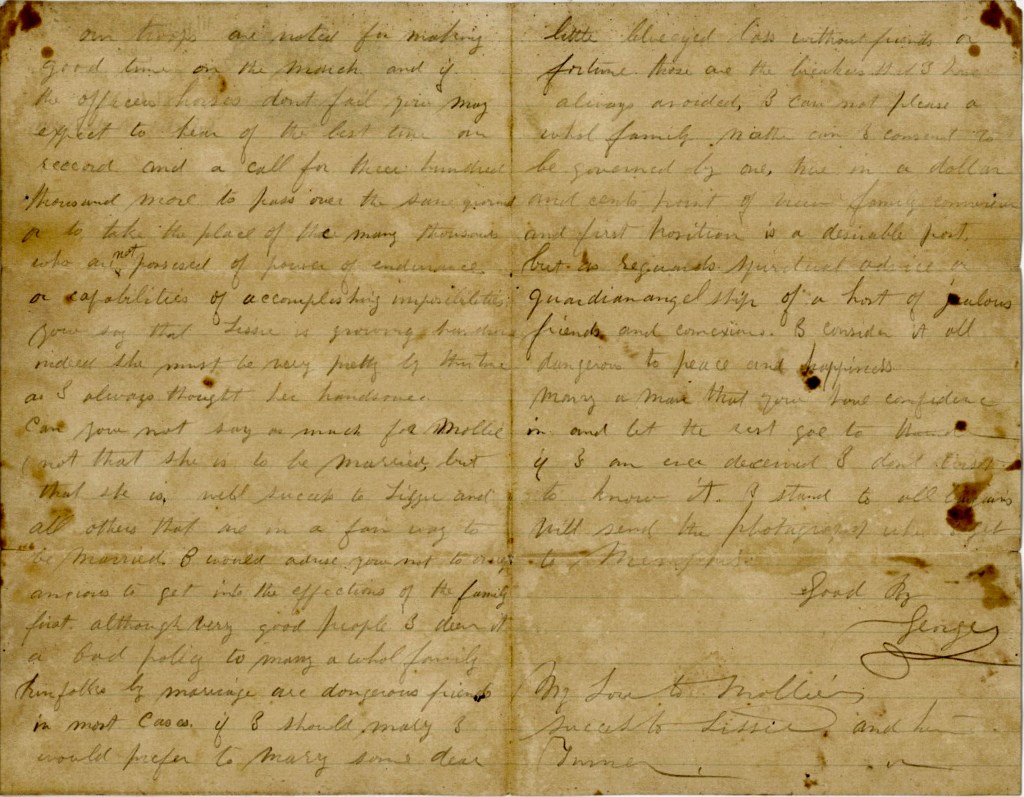 Marry a man that you have confidence in and let the rest go to thunder. If I am ever deceived, I don’t wish to know it. I stand to all [ ]. Will send the photographs when I get to Memphis. Goodbye, — George