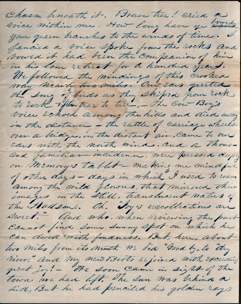 We followed the windings of this crooked way nearly two miles. Our ears greeted the song of birds as they skipped from rock to rock and from tree to tree. The cow boy’s voice echoed among the hills and died away in tyhe distance. The rattle of carriage wheels over a bridge in the distant air came to our ears with the north wind, and a thousand familiar incidents were pressed deeply on memory’s tablet, making me mindful of other days—days in which I used to roam among the wild flowers that mirrored their images in the still, translucent water of the Hudson.