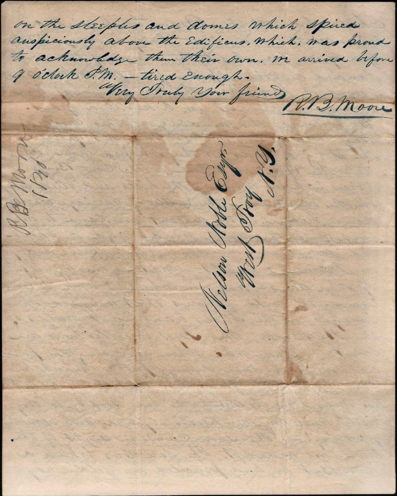 This letter was penned by Ransom Baldwin Moore (1818-1880), the son of Charles Moore (1783-1846) and Uretta Vernon (1788-1855) of Saratoga county, New York. An obituary informs us that Ransom came to Troy in 1837 where he engaged in the dry goods business at No. 9 Cannon Place. He 1843 he entered into partnership with E. & H. Merriam, book and stationery dealers, who, under the firm name of Merriam, Warren & Co., carried on business. H. B. Nims bought out Merriam in 1853 and partnered with Moore until 1869 when Moore retired.