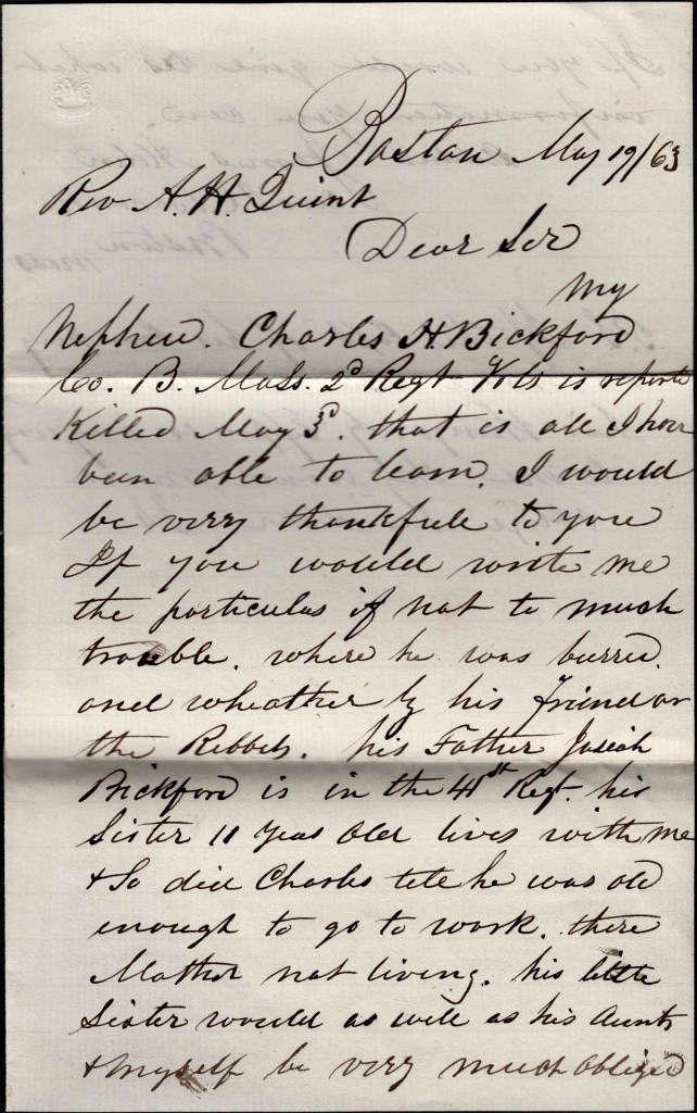My nephew Charles H. B. Bickford, Co. B, Massachusetts 2nd Regiment, is reported killed May 3rd. That is all I have been able to learn. I would be very thankful to you if you would write me the particulars if not too much trouble, where he was buried and whether by his friends or the Rebels. His father, Josiah Bickford is in the 41st Regiment. His sister, 11 years old, lives with me & so did Charles till he was old enough to go to work. Their mother not living, his little sister would as well as his aunts and myself be very much obliged if you would give us what information you can.