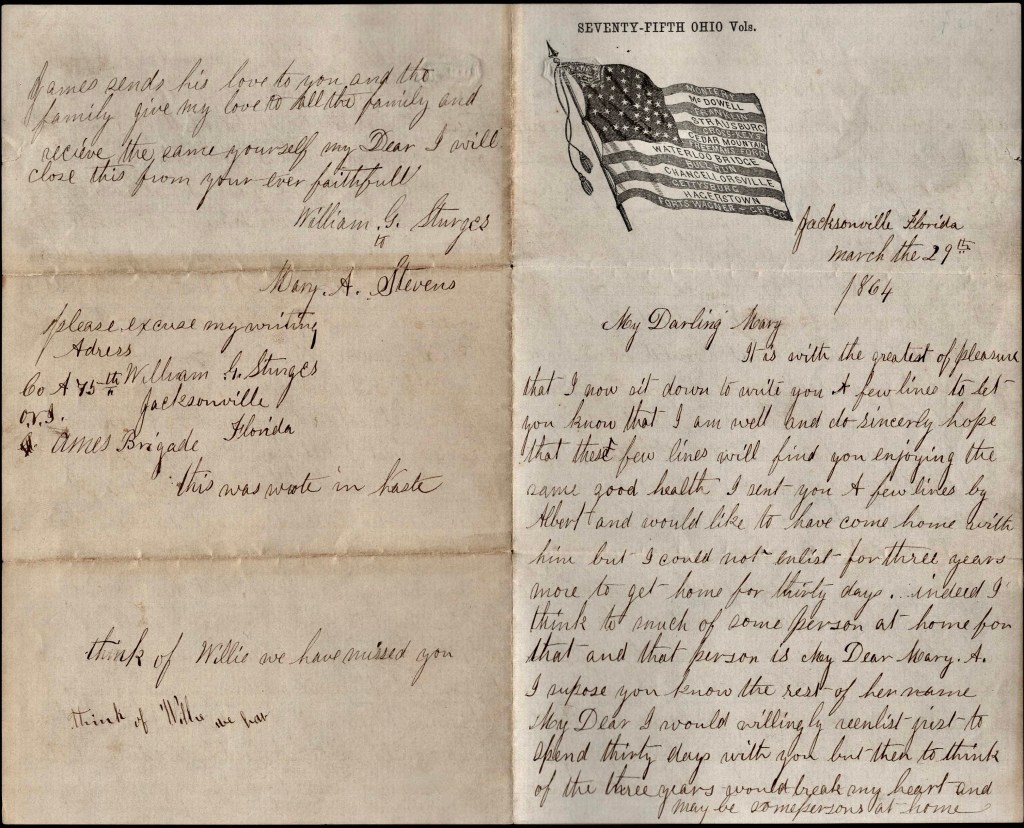 Please excuse my writing. Address William G. Sturges, Co. A, 75th OVI, Ames Brigade, Jacksonville, Florida