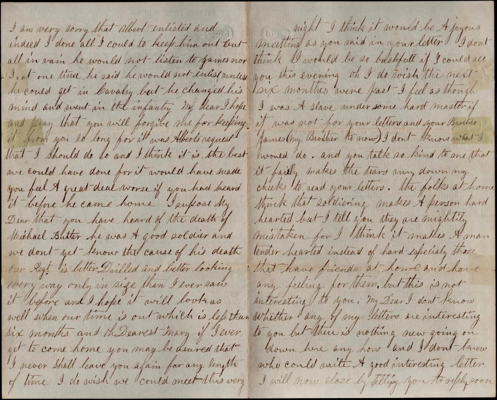 I am very sorry that Albert enlisted and indeed, I done all I could to keep him out but all in vain. He would not listen to James nor I. At one time he said he would not enlist unless he could get in csavalry but he changed his mind and went in the infantry. My dear, I hope and pray that you will forgive me for keeping it from you so long for it was Albert’s request that I should do so and I think it is the best we cold have done for it would have made you feel a great deal worse if you had heard it before he came home. I suppose, my dear, that you have heard of the death of Michael Butler. He was a good soldier and we don’t yet know the cause of his death. 1