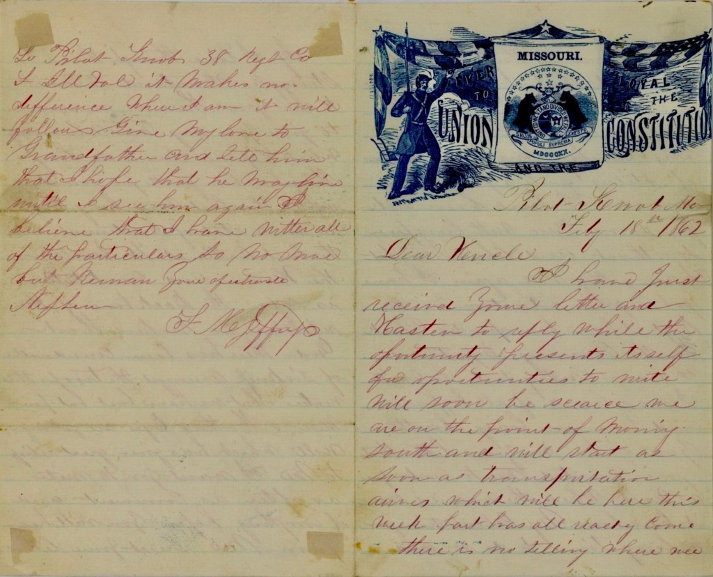 There has been considerable of sickness amongst the troops this winter but we have lost but few men. Mother’s eyes are getting well which has given great relief to me. I want you to write as often as convenient and if anything happens, you will hear from me. Direct your letters to Pilot Knob, 38th Regt., Co. F, Illinois Volunteers. It makes no difference where I am, it will follow.