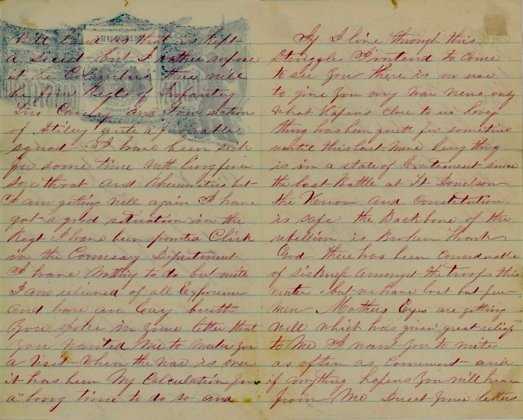 I have been sick for some time with lung fever, sore throat, and rheumatics but I am getting well again. I have got a good situation in the regiment. I have been appointed clerk in the Commissary Department. I have nothing to do but write. I am relieved of all exposure and have an easy berth.