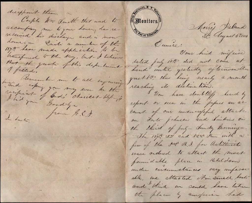 You have doubtless heard by report or seen in the papers an account of our unsuccessful attack on Forts Johnson and Simkins on the third of July—Sunday morning. The 127th New York and 52nd Pennsylvania with a few of the 3rd Rhode Island for artillerists were ordered to attack the most formidable place in Rebeldom under circumstances very unfavorable. We attacked it in small boats and I think we could have taken the place by surprise had the whole of the 52nd obeyed orders. The regiment is most all substitutes. The few old soldiers of the regiment done as ordered but because they were not supported properly by the balance of their regiment, they were taken prisoners. They were to attack Johnson while we attacked Simkins & the forts lay in such a position that the 52nd had to go ahead in order to strike both at once, and in waiting for them so as to carry out the order of the General, we became belated until we were observed by the enemy and driven back with considerable loss. God knows the fault was not with the 127th for every man went determined to win a or die and I can assure you if we ever have an opportunity, we will wipe out the stain.
