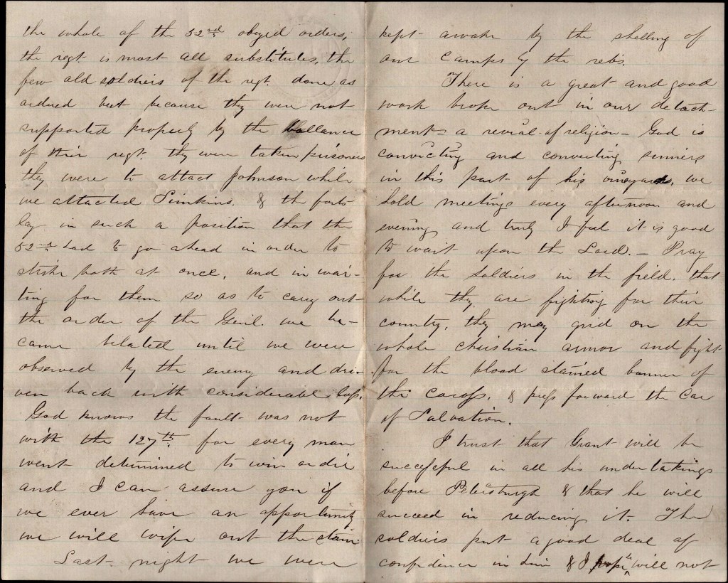Last night we were kept awake by the shelling of our camps by the rebs. There is a great and good work broke out in our detachment—a revival of religion. God is convicting and converting sinners in this part of his vineyard. We hold meetings every afternoon and evening and truly I feel it is good to wait upon the Lord. Pray for the soldiers in the field that while they are fighting for their country, they may gird on the whole christian armor and & fight for the blood stained banner of the cross & press forward the cause of salvation.