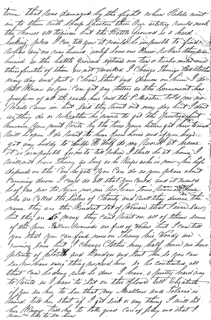 We have some women here who are called the Sisters of Charity and well they deserve the name. They are the kindest set of women that I ever saw. But there are so many, they can’t wait on all of them. Some of the poor fellows’ wounds are full of worms, but I can tell you that you can find none on Tommy. His wounds are running some but I change cloths ever half hour. We have plenty of cloths and bandages and lint here so you. can see we have everything we need here. So be contented. All that can be done, will be done.