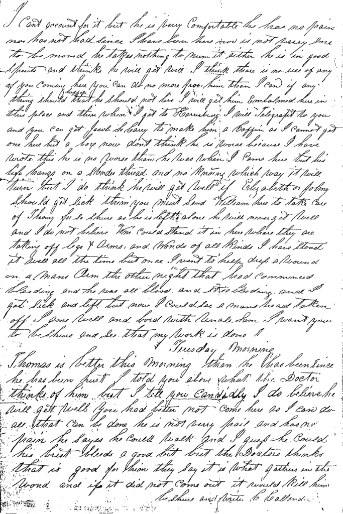I cant account for it but he is very comfortable. He has no pain nor has not had since I have been here nor is not very sore to be moved. He takes nothing to numb it either. He is in good spirits and thinks he will get well. I think there is no use of any of you coming here. You can do no more for him than I can. If anything should happen that he should not live, I will get him embalmed here in this place and then when I get to Harrisburg, I will telegraph to you and you can get Jacob S. Carey to make him a coffin as I cannot get one here but a box. Now don’t think he is worse because I have wrote this. He is no worse than he was when I came here but his life hangs on a slender thread and no knowing which way it will turn. But I do think you must send William here to take care of Tommy for so sire as he is left alone, he will never get well and I do not believe William could stand it in here where they are taking off legs and arms, and wounds of all kinds. I have stood it well all the time but once. I went to help dress a wound on a man’s arm the other night that had commenced bleeding and he was all blood and still bleeding and I got sick and left. But now I could see a man’s head taken off. I am well and bored with Uncle Sam. I want you to be sure and see that my work is done.