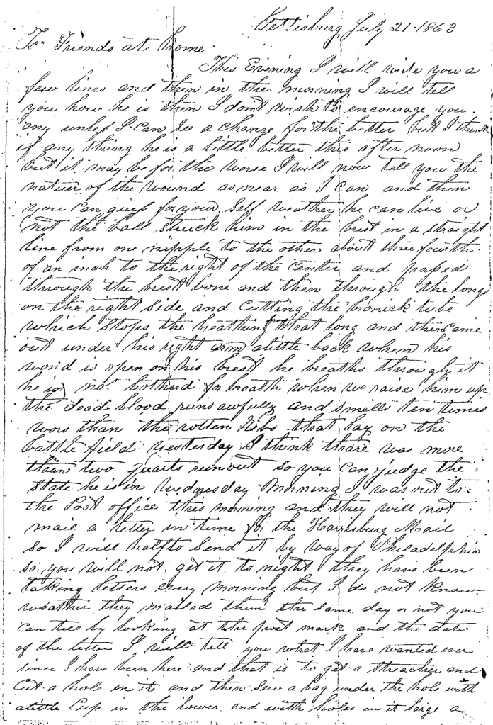 This evening I will write you a few lines and then in the morning I will tell you how he is then. I don’t wish to encourage you any unless I can see a change for the better this afternoon, but it may be for the worse. I will now tell you the nature of the wound as near as I can, and then you can guess for yourself whether he can live or not.