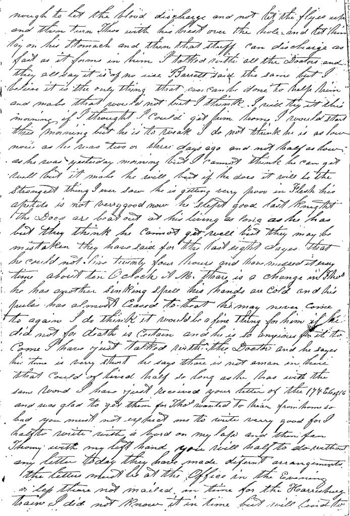 Wednesday morning. I was out to the Post Office this morning and they will not mail a letter in time for the Harrisburg mail so you. will not get it tonight. They have been taking letters every morning but I do not know whether they mailed them the same day or not. You can tell by looking at the post mark and the date of the letter. I will tell you what I have wanted ever since I have been here and that is to get a stretcher and cut a hole in it and then sew a bag under the hole with a little cup in the lower end with holes in it large enough to let the blood discharge and not let the flies up and then turn Thomas with his breast over the hole and let him lay on his stomach and then that stuff can discharge as fast as it forms in him. I talked with all the doctors and they all say it is of no use. Barrett said the same. But I believe it is the only thing that can be done to help him and maybe that would not. But I think I will try it this morning. If I thought I could get home, I would start this morning but he is too weak. I do not think he is as low as he was yesterday morning but I do. not think he can get well. But it may be he will, but if he does, it will be the strangest thing I ever saw. He is getting very poor in flesh. His appetite is not very good now. He slept good last night. The doctors are beat out at his living as long as he has but they think he cannot get well. But they may be mistaken. They have said for the last eight days that he could not live 24 hours and have missed it every time.