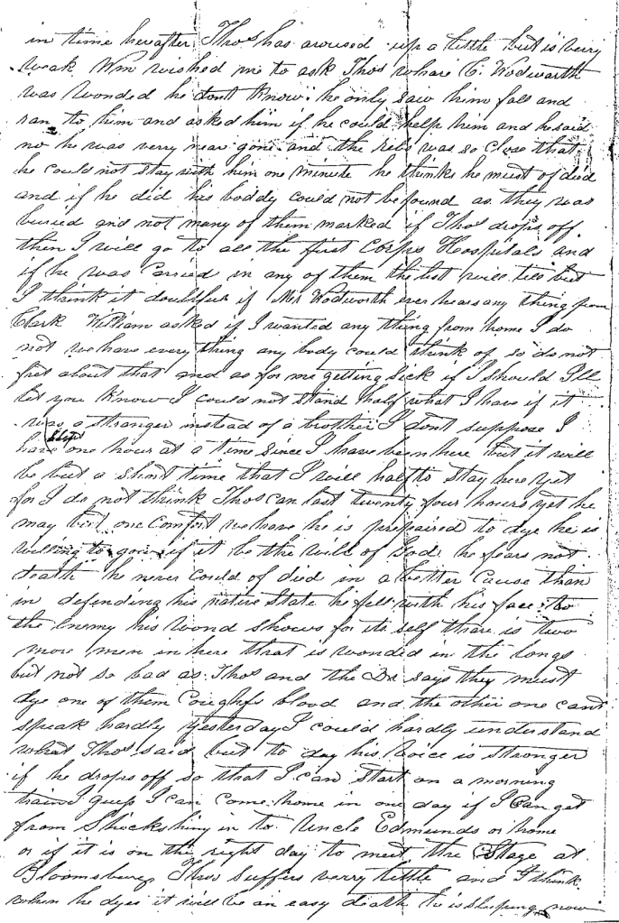There are about seventy patients in this church. I suppose out on the battle ground in those tents the wounded are not half taken care of like they are here. I do not know where Lee’s army are. We can’t get papers in time. Thomas has aroused up a little but is very weak. William wished me to ask Thomas where C. Wadsworth was wounded. He don’t know. He only saw him fall and ran to him and asked him if he could help him and he said no. He was very near gone and the rebs was so close that he could not stay with him one minute. He thinks he must of died and if he did, his body could not be found as they was buried and not many of them marked. If Thomas drops off, then I will go to all the 1st Corps Hospitals and if he was carried in any of them, the last will tell but I think it doubtless if Mr. Wadsworth ever hears anything from Clark. William asked if I wanted anything from home. I do not. We have everything anybody could think of so do not fret about that and as for me getting sick. If I should, I’ll let you know. I could not stand half what I have if it was a stranger instead of a brother. I don’t suppose I have slept one hour at a time since I have been here yet, for I do not think Thomas can last twenty-four hours. Yet he may. But one comfort we have he is prepared to die. He is willing to go if it be the will of God. He fears not death. He never could of died in a better cause than in defending his native State. He fell with his face to the enemy. His wound shows itself.