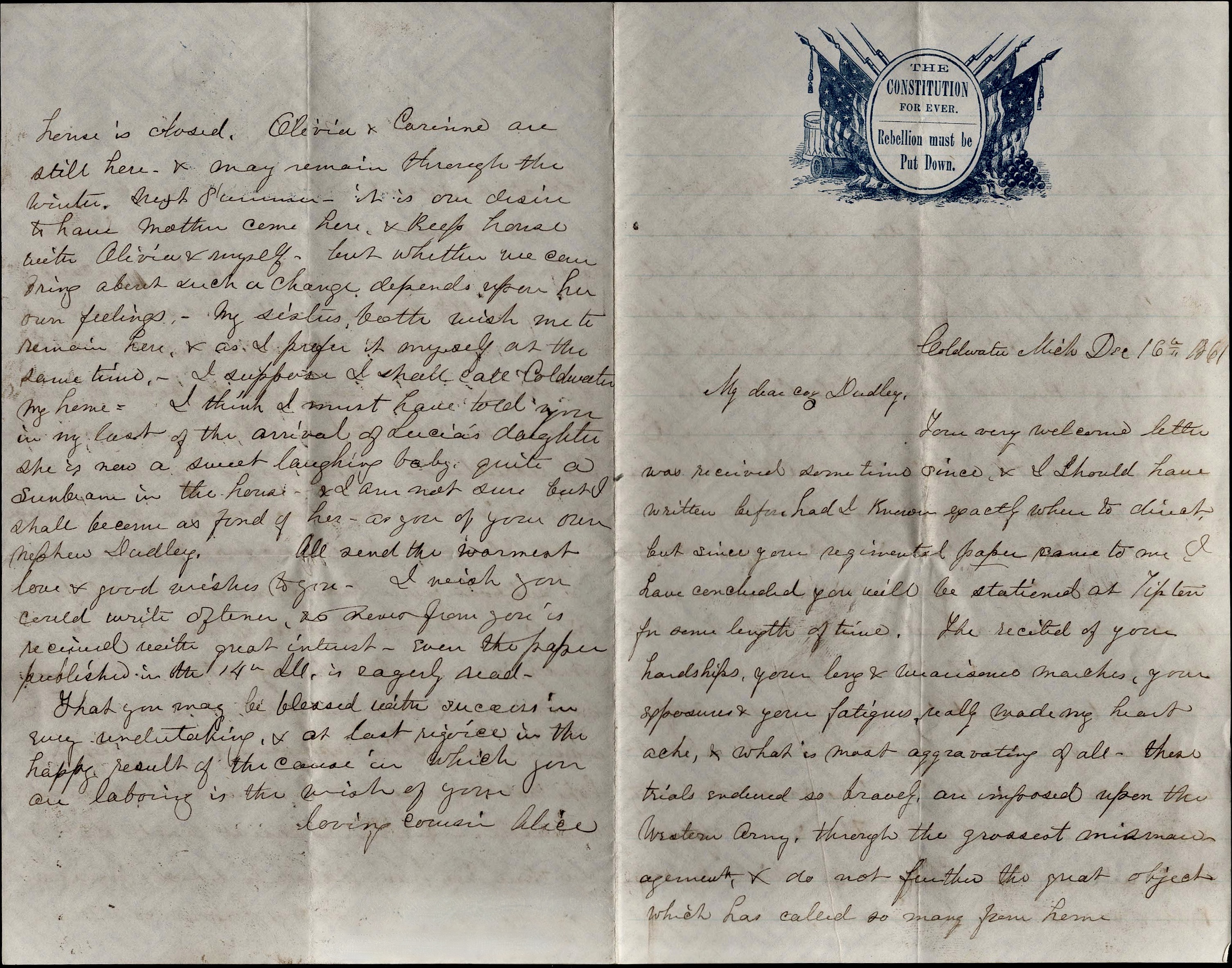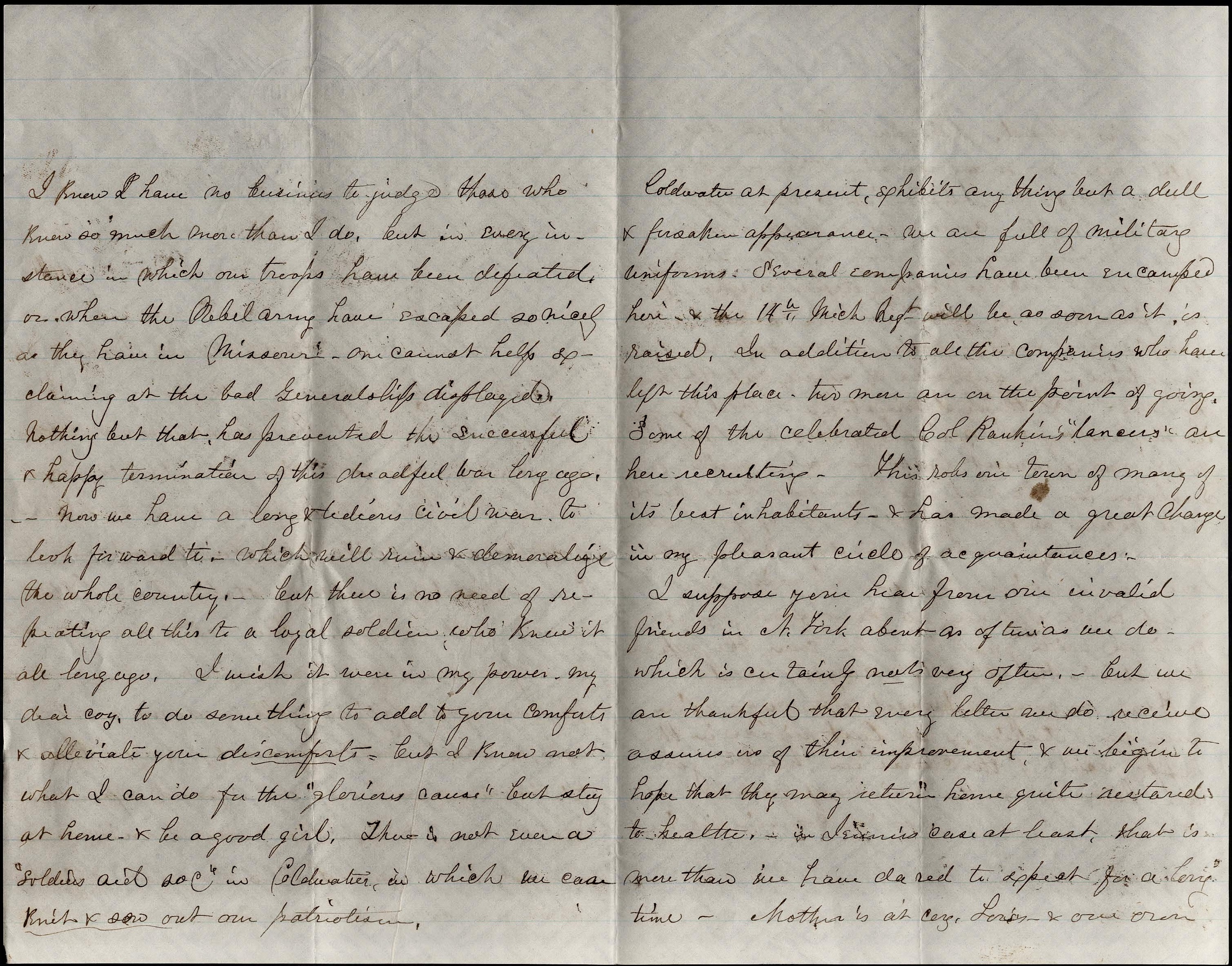I know I have no business to judge those who know so much more than I do, but in every instance in which our troops have been defeated or when the Rebel army have escaped so nicely as they have in Missouri, one can’t help exclaiming at the bad generalship displayed. Nothing but that has prevented the successful & happy termination of this dreadful war long ago. Now we have a long & tedious civil war to look forward to which will ruin & demoralize the whole country. But there is no need of repeating all this to a loyal soldier who knew it all long ago. I wish it were in my power, my dear coz, to do something to add to add to your comforts & alleviate your discomfort. But I know not what I can do for the “glorious cause” but stay at home & be a good girl. There is not even a “soldier’s aid society” in Coldwater in which we can knit & sow out our patriotism.
