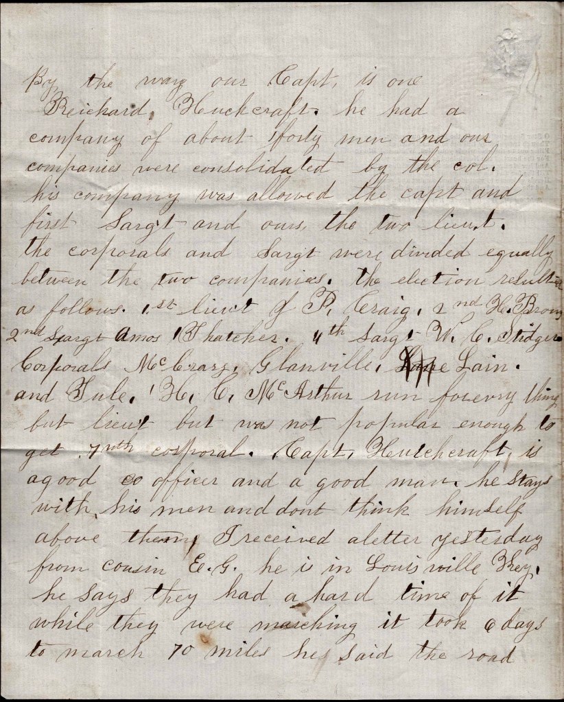 By the way, our captain is one Richard [Williams] Hutchcraft. He had a company of about forty men and our companies were consolidated by the colonel. His company was allowed the captain and first sergeant and ours, the two lieutenants. The corporals and sergeants were divided equally between the two companies. The election results as follows: 1st Lieutenant J. P. Craig, 2nd [Lieutenant] H. Brown, 2nd Sergeant Amos Thatcher, 4th Sergeant W. C. Stidger, Corporals McCrasry, Glanville, Lane, and Tool. H. C. McArthur run for everything but lieutenant but was not popular enough to get 7th Corporal.