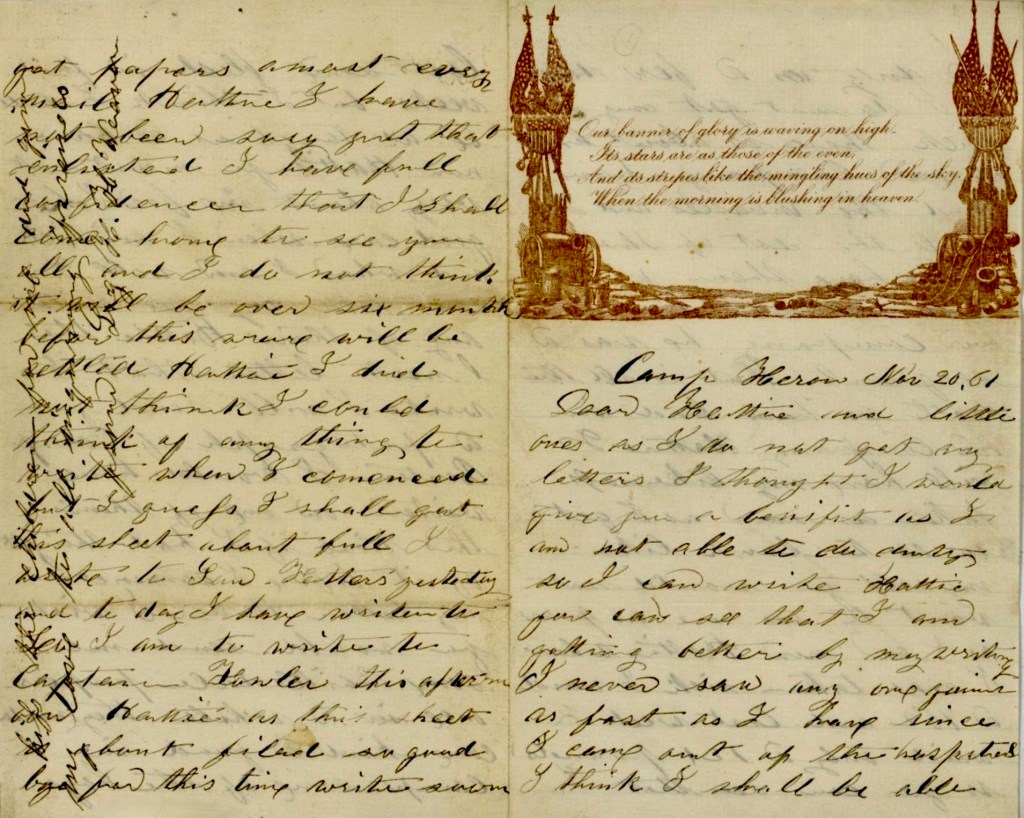 Hattie, you must not worry about me for I have good care when I am sick and when I am well, I can hold my row with any of them. Hattie, the next letter that I write, I will send you a photograph of Camp Benton. I would have written on one of them this time if I had thought of it before I commenced my letter. Hattie, I wish you would send me some Hillsdale papers once in a while. They would come kind a good in camp. Some of the boys got papers a most every mail. Hattie, I have not been sorry yet that I enlisted. I have full confidence that I shall come home to see you all and I do not think it will be over in six months before this war will be settled. Hattie, I did not think I could think of anything to write when I commenced but I guess I shall get this sheet about full. I wrote to Sam Ketters yesterday and today I have written to Captain Fowler this afternoon.