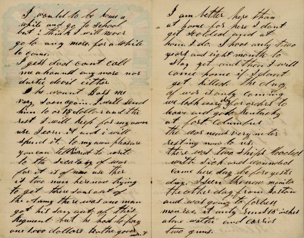 The dogs of war is only coming. We look every day for orders to leave and go to Kentucky at Fort Columbus. The war news [is] very interesting. now to us. There was two ships loaded with sick and wounded came here day before yesterday. I seen the new monitor the other day from Boston and was going to Fortress Monroe. It only runs 15 inches above water an carries two guns.