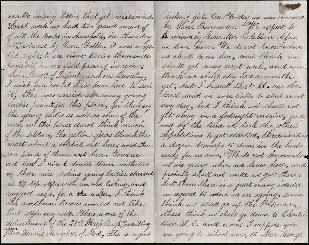 Last week we had two grand reviews of all the troops in Annapolis. On Thursday we was reviewed by Gen. Foster. It was a splendid sight to see about twelve thousand troops all in one field passing in review—eleven regiments of infantry and one cavalry. I wish you. could have been here to seen it. There was considerable many young ladies as well as some of the men in this place do not think much of the soldiers. The yellow girls think the most about a soldier out here and there is a plenty of them here. you see out here a nice double team with two or three nice looking young ladies dressed in tip top style, with an old looking and ragged negro for a waiter. I think the northern ladies would not like that style very well.