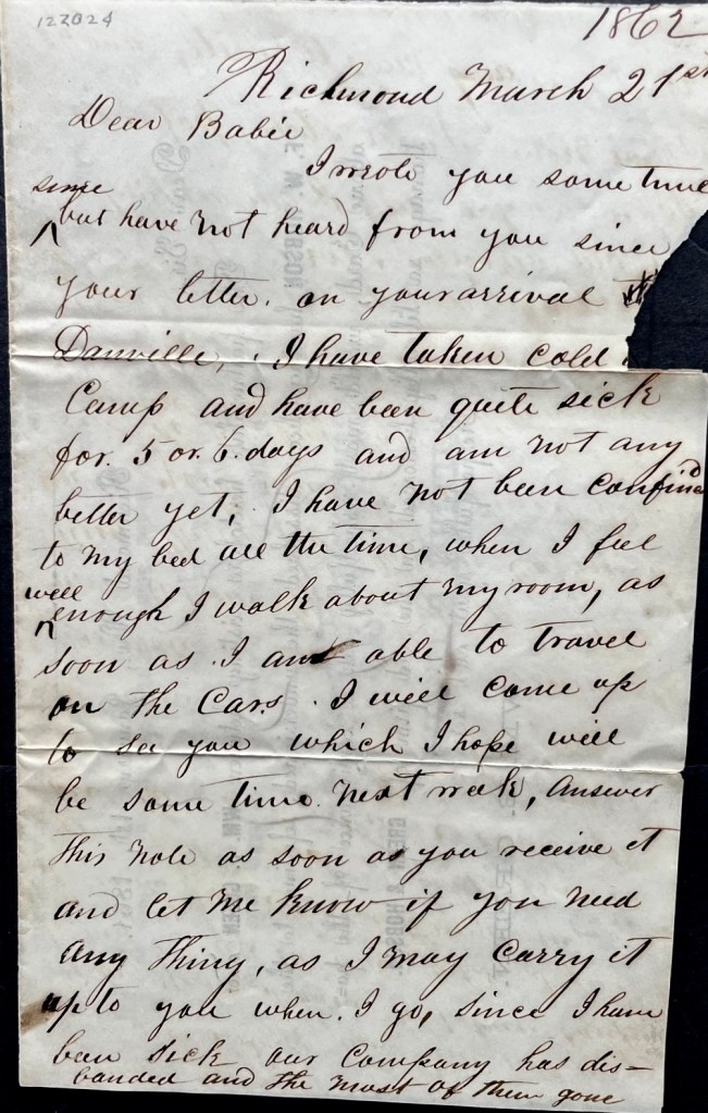 I wrote you some time since but have not heard from you since your letter on your arrival at Danville. I have taken cold in camp and have been quite sick for 5 or 6 days and am not any better yet. I have not been confined to my bed all the time. When I feel well enough, I walk about my room. assoon as I am able to travel on the cars, I will come up to see you which I hope will be sometime next week. Answer this note as soon as you receive it and let me know if you need anything as I may carry it up to you when I go. Since I have been sick, our company has disbanded and the most of them gone home. I was sorry but could not help it so many of them getting exempt on account of being a widow’s overseer and about 20 sick ones in camp.