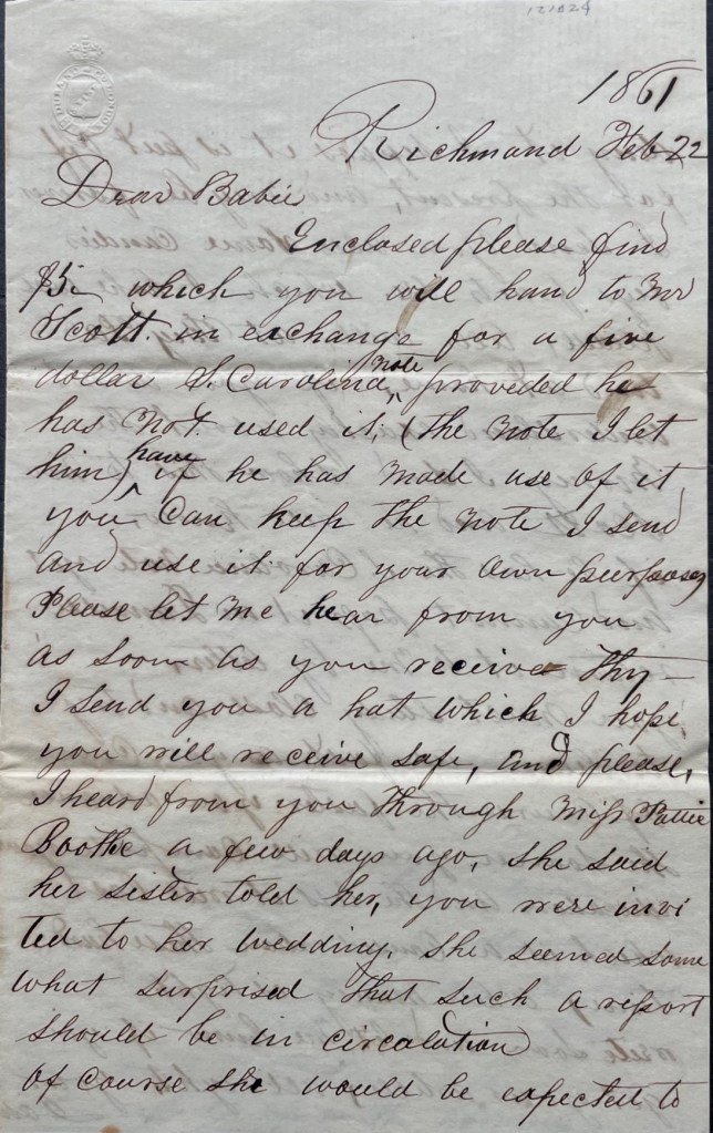 I send you a hat which I hope you will receive safe, and please, I heard from you through Miss Pattie Boothe a few days ago. She said her sister told her you were invited to her wedding. She seemed somewhat surprised that such a report should be in circulation. Of course she would be expected to deny it. I suppose it is put off for the present, and may be forever. I send you also some candies, figs, fruits, &c. which I hope will please.