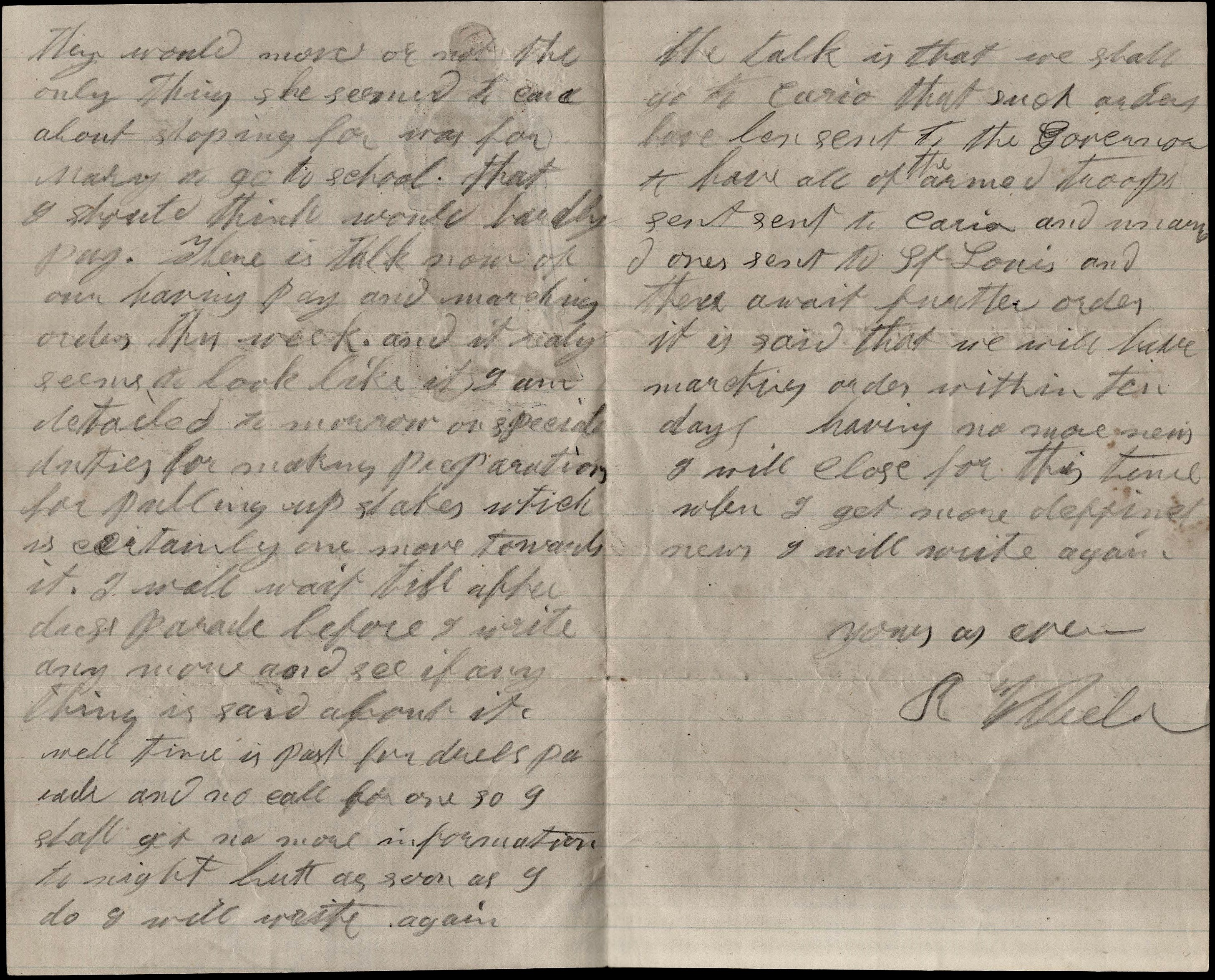 Well, time is past for dress parade and no call for one so I shall get no more information tonight, but as soon as I do I will write again. The talk is that we shall go to Cairo—that such orders have been sent to the Governor to have all of the armed troops sent to Cairo and the remaining ones sent to St. Louis and there await further orders. It is said that we will have marching orders within ten days.