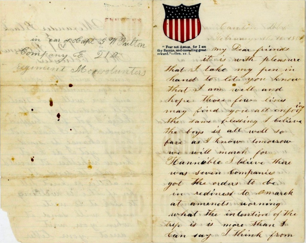 It is with pleasure that I take my pen in hand to let you know that I am well and hope these few lines may find you all enjoying the same blessing. I believe the boys is all well so far as I know. Tomorrow we will march for Hannibal. I believe there are seven companies for the orders to be in readiness to march at a minute’s warning. What the intention of the trip is is more than I can say. I think from what I can find out, we will be stationed at Hannibal.
