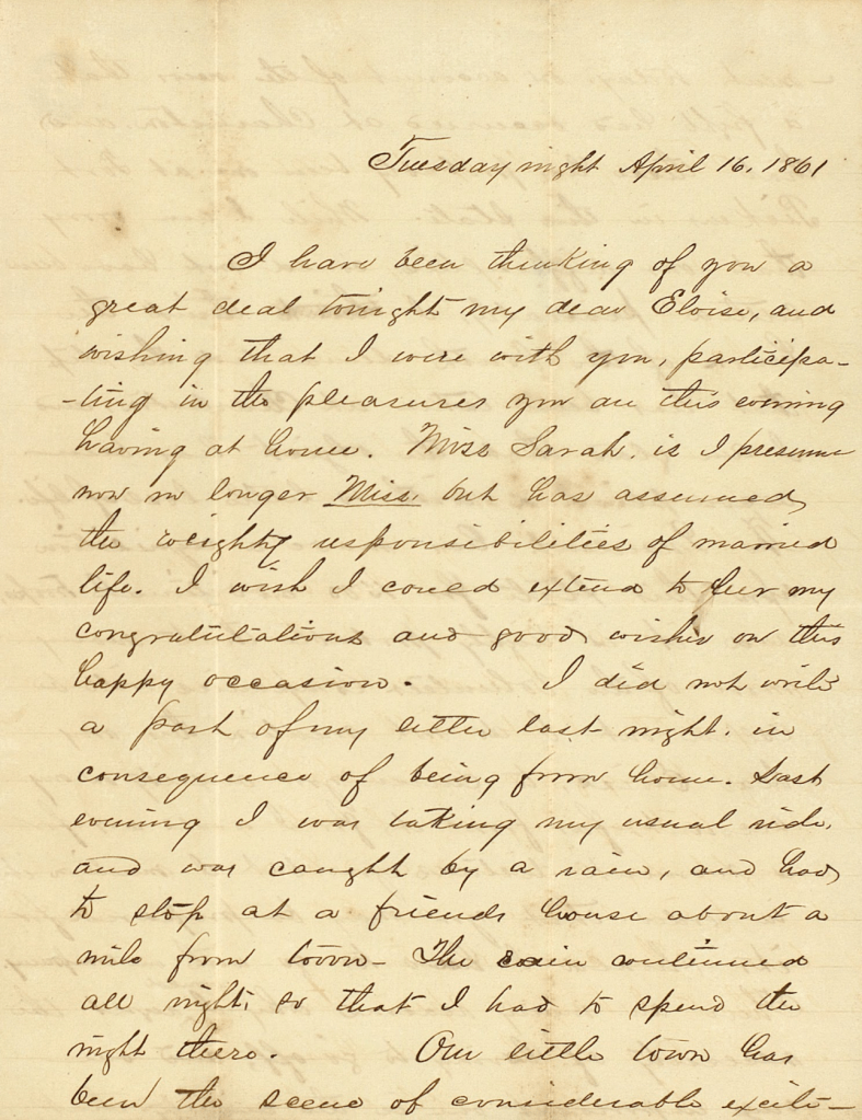 I have been thinking of you a great deal tonight my dear Eloise, and wishing that I were with you, participating in the pleasures you are this. evening having at home. Miss Sarah is, I presume now in longer Miss, but has assumed the weighty responsibilities of married life. I wish I could extend to her my congratulations and good wishes on this happy occasion. I did not write a part of my letter last night in consequence of being from home. Last evening I was taking my usual ride and was caught by a rain, and had to stop at a friend’s house about a mile from town. The rain continued all night so that I had to spend the night there.
