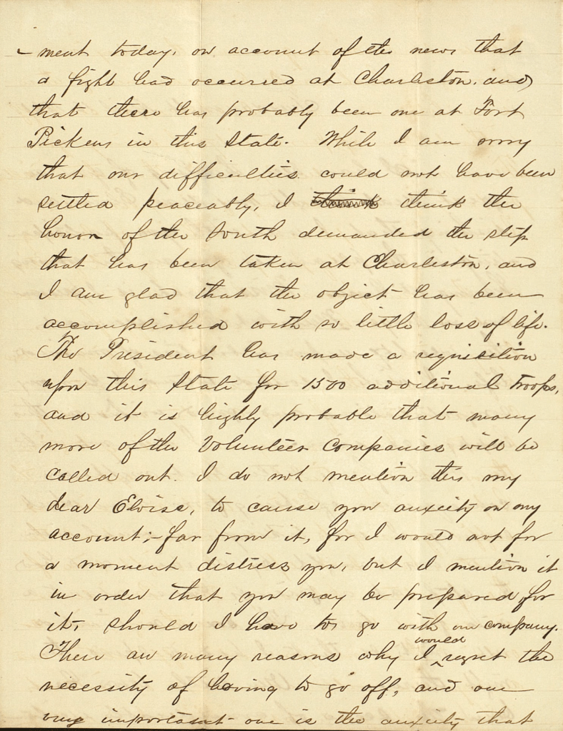 Our little town has been the scene of considerable excitement today on account of the news that a fight had occurred at Charleston and that there has probably been one at Fort Pickens in this state. While I am sorry that our difficulties could not have been settled peaceably, I think the honor of the South demanded the step that has been taken atCharleston, and I am glad that the object has been accomplished with so little loss of life.