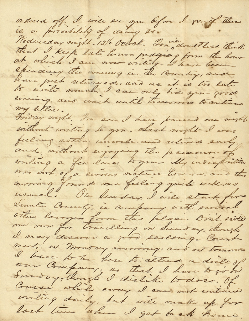 On Sunday I will start for Sumter county in company with several other lawyers from this place. Don’t scold me for traveling on Sunday, though I may deserve a good scolding. Court meets on Monday morning and on tomorrow I have to be here to attend a drill of our company, so that I have to go on Sunday though I dislike to do so. Of course while away I cannot continue writing daily, but will make up for lost time when I get back home.