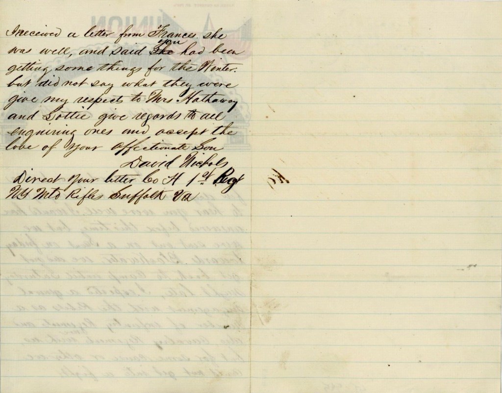 I received a letter from Frances. She was well and said you had been getting some things for the winter but did not say what they were. Give my respects to Mrs. Hathaway and Lottie. Give regards to all enquiring ones and accept the love of your affectionate son. — David Nichols