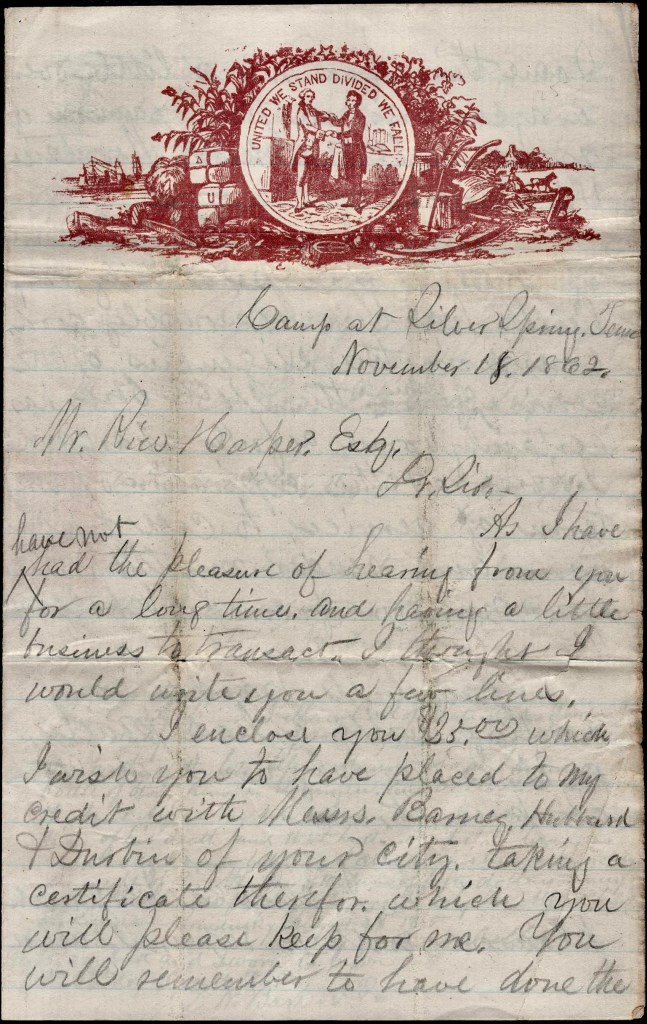 As I shall be much pleased with a reply, I enclose you some P.O. currency and would esteem it a favor if you would send me a statement of my bank account, and a few P. O. stamps. Believe me yours very truly, — Alfred Marson, Co. C, 24th Ohio Infantry