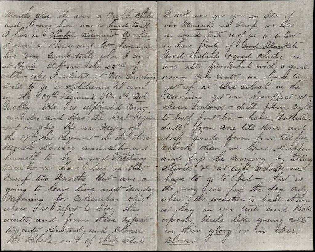 But on the 22nd of October 1861 I enlisted at my country’s call to go a soldiering. I am in the 29th [Ohio] Regiment, Co. H, Col. [Lewis P.] Buckley. He is a splendid commander and has the best regiment in Ohio. He was Major of the 19th Ohio Regiment in the three months service and showed himself to be a good military man. We have been in this camp two months but are a going to leave here next Monday morning for Columbus, Ohio, where we expect to stay this winter, and from there expect to go into Kentucky and clean the Rebels out of that state.