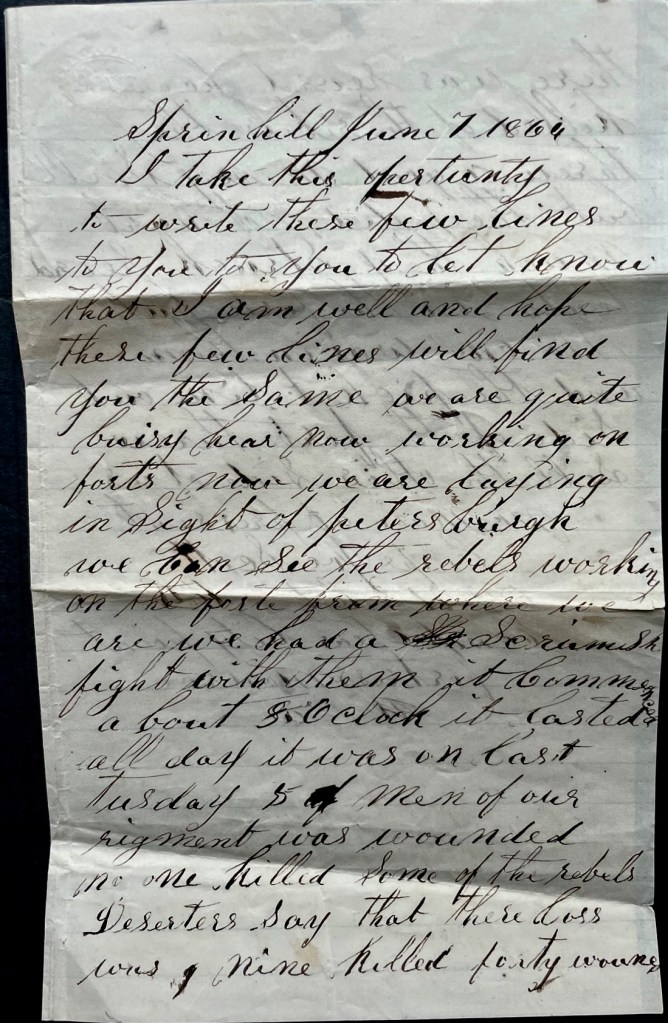 I take this opportunity to write these few lines to you to let you know that I am well and hope these few lines will find you the same. We are quite busy here now working on forts now. 2 We are laying in sight of Petersburg. We can see the rebels working on the fort from where we are.