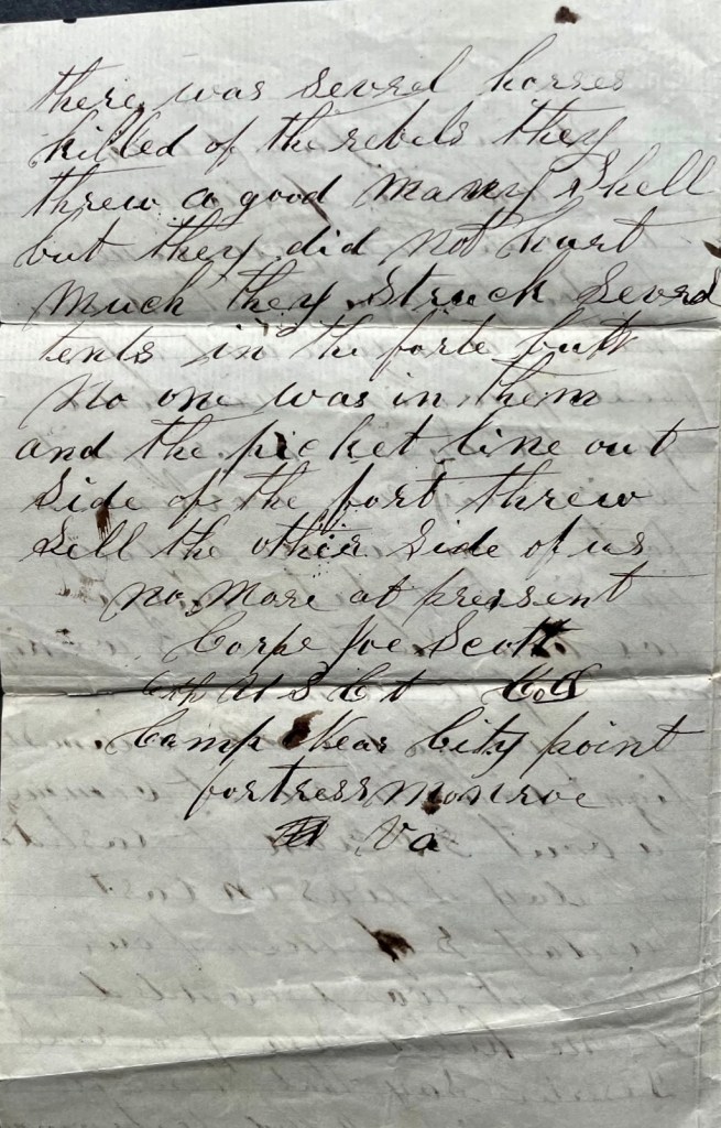 No more at present. Corp. Joe Scott, 6th USCT, Co. D, Camp near City Point, Fortress Monroe, Va.