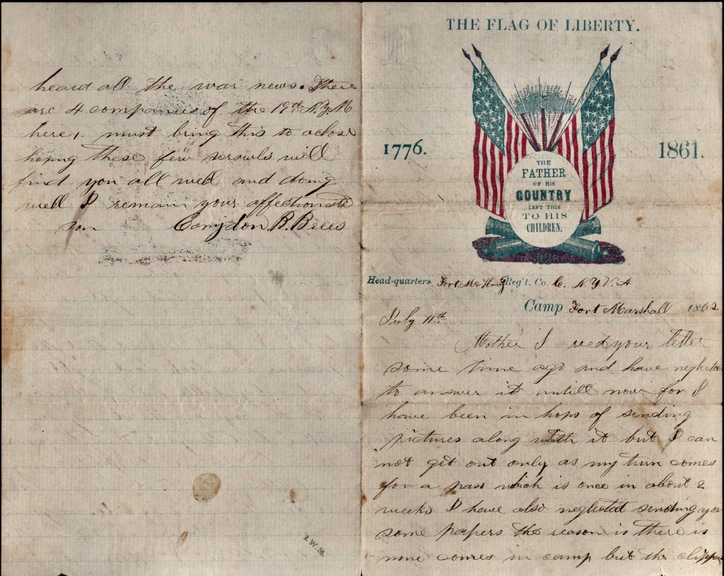 I just learned that the prisoner we took last night had a big bottle full of strychnine and the boys are threatening some rather hard things to him. They came in a bad place to practice any such thing as that. We are looking out for them on every side. We go in swimming twice a week in the Patapsco River. I suppose you have heard all the war news. There are four companies of the 19th New York Militia here. Must bring this to a close hoping these few scrawls will find you all well and doing well. I remain your affectionate son, — Corydon B. Brees