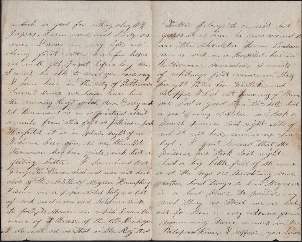I have been in the city of Baltimore twice since we have been here. The cavalry regiment which Sam Early and Ed Hammond is in is quartered about a mile from this fort at Patterson Park Hospital. It is in plain sight of us. I have been over to see them. Ed Hammon has been quite sick but is getting better. I have heard that George Van Dusen died and was sent home. Also of the death of Myron Humphrey.